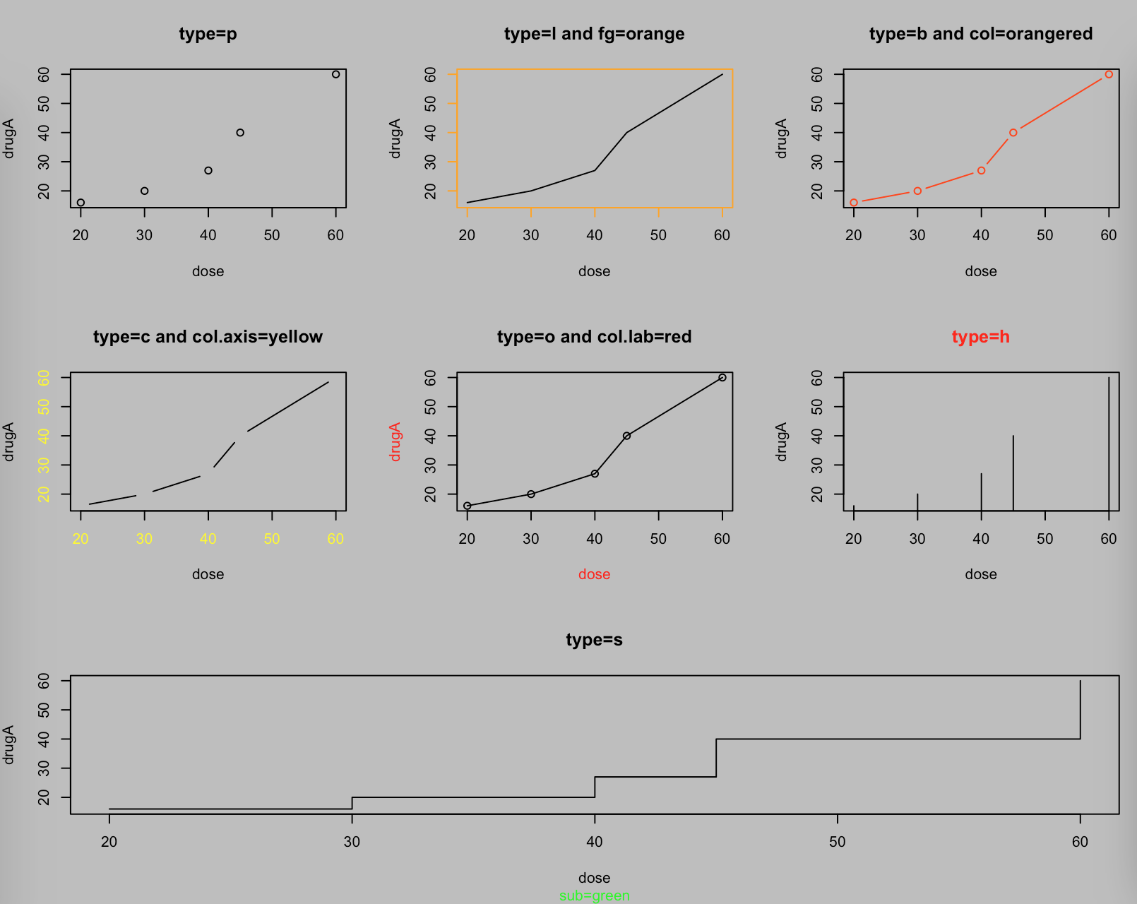 plot(dose,drugA,type="s",col.sub="green",main = "type=s",sub = "sub=green")