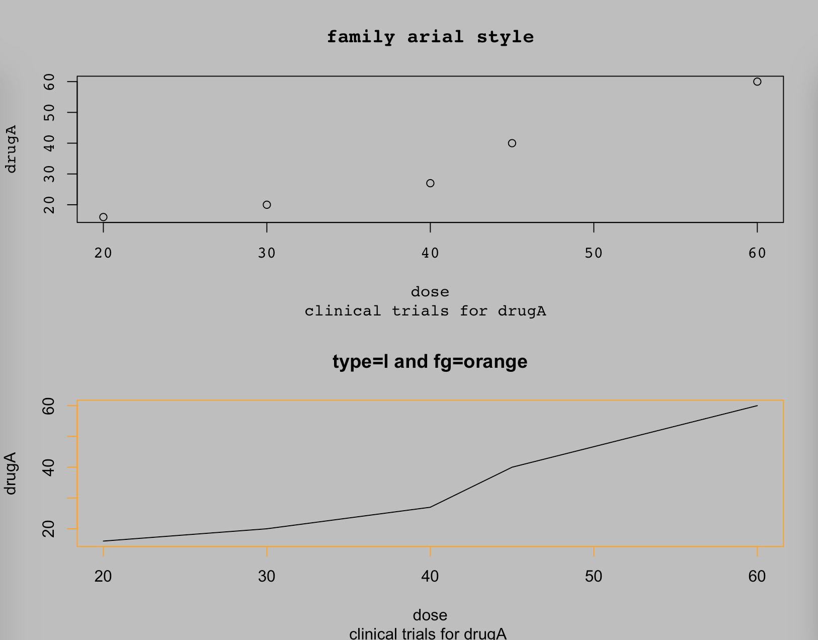 title(main="type=l and fg=orange",sub = "clinical trials for drugA ")