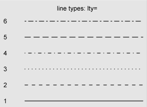 pch: 绘制点时使用的符号 lty:指定线条类型 lwd:线条宽度(默认值1,lwd=2表示为默认值的2倍)