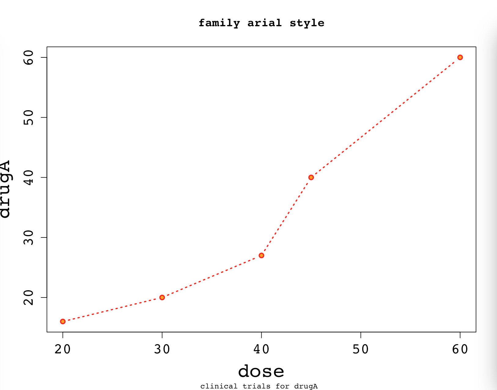 plot(dose,drugA,type="b",pch=21,col="red",bg="orange",lty=3,lwd=2,main="family arial style",