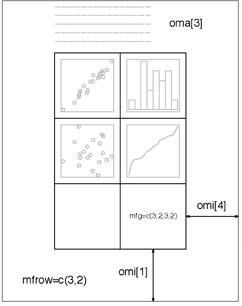 (2)只能通过函数par()进行设置。包括参数:"ask","fig","fin","lheight","mai","mar","mex","mfcol","mfrow","mfg","new","oma","omd","omi","pin","plt","ps","pty","usr","xlog","ylog"