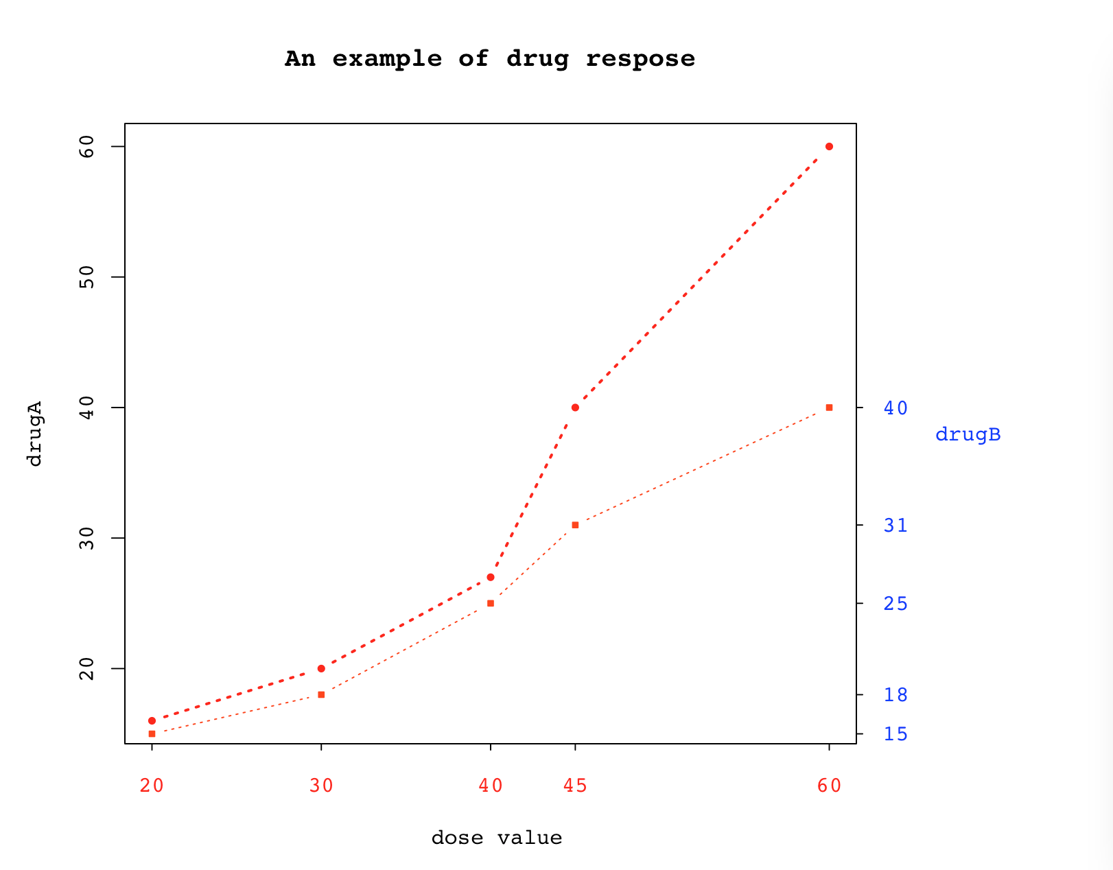 lines(dose,drugB,type = "b",pch=22,cex=0.6,col="orangered",bg="orangered",lty=3)