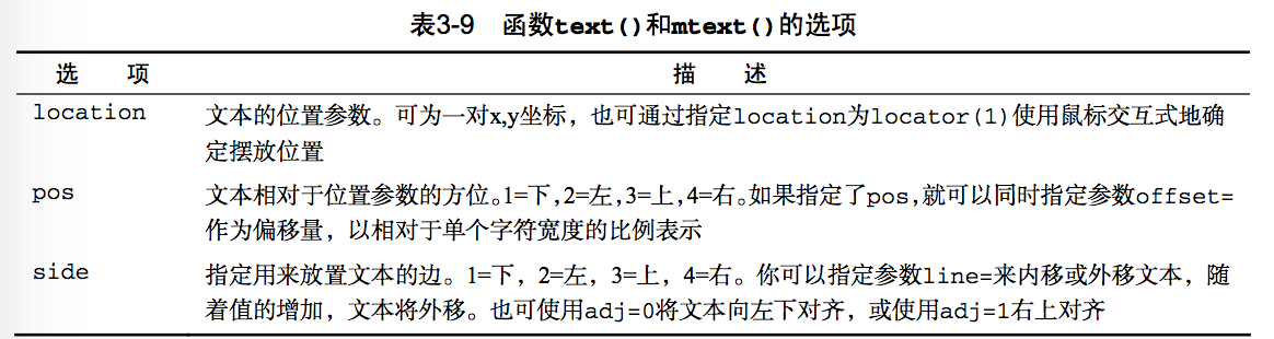 (1)text(location,"text to place",pos,……)(2)mtext("text to place",side,line=n,……)