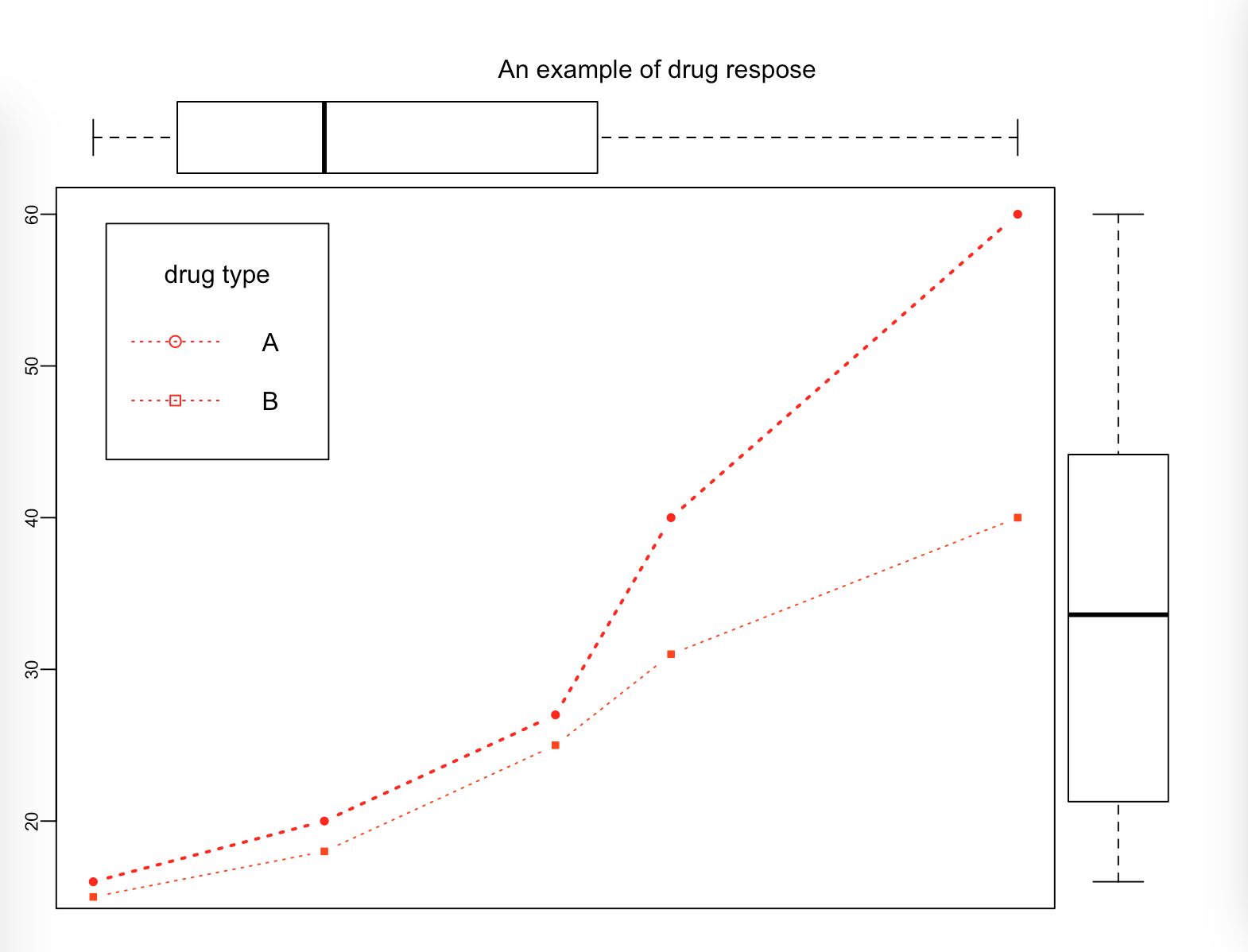 egend("topleft",inset = .05,title = "drug type",c("A","B"),lty = c(3,3),pch = c(21,22),col=c("red","red"))
