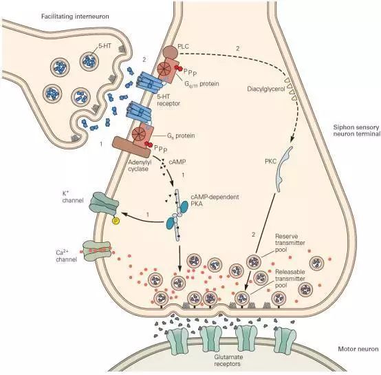 紧接着,cAMP进一步激活了蛋白激酶A(PKA),从而关闭特异性钾离子通道S通道,产生慢突触后膜电位,使得短时记忆成为可能。