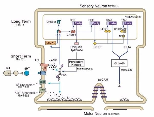 坎德尔发现,当反复刺激产生的5-羟色胺会使得蛋白激酶A向细胞核内转移,在核内激活一种称为CREB(环磷腺苷效应元件结合蛋白)的调节蛋白。