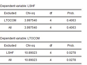 格兰杰检验结果是LSHF是LTOCOM格兰杰原因,在5%的水平上显著。但是脉冲响应右上角的图,LTOCOM对LSHF的冲击反应并不明显??想请教一下,这是什么原因?