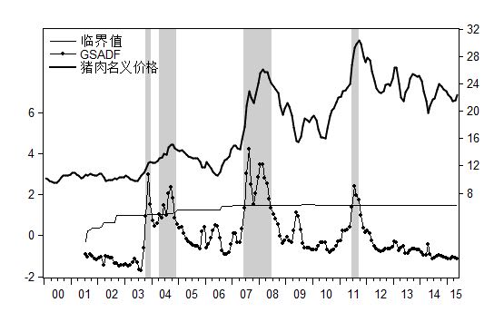 做了一个关于农产品GSADF检验,软件用的Eviews,得到了统计值和临界值等,想得到它的价格泡沫区间,大概像下图那样的。请问灰色区间部分怎么得到?