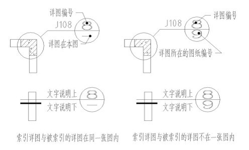 1、是否规范表示了详图索引、详图编号,要在相应的平面、或立面、或剖面中表示索引符号,符号大小要符合制图规范的要求。