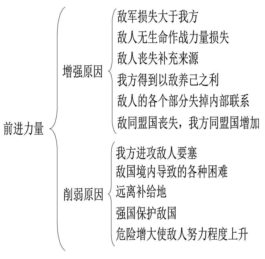 战争是两种力量的对抗,绝对力量削弱并不很重要,重要的是敌人削弱的比我方的多,也就是说战争是两种力量的比拼,力量大的一方更容易获胜,一方力量的削弱,相当另一方力量的加强,比拼的是相对优势。军队在前进过程中,存在7种增加力量的原因和5种削弱力量的原因,要考察最终双方力量的对比情况,这是最重要的。7种导致力量增强的原因包括:敌军损失大于我方;敌人无生命作战力量损失;敌人丧失补充来源;我方得到以敌养己之利;敌人的各个部分失掉内部联系;敌同盟国丧失,我方同盟国增加。5种导致力量削弱的原因包括:我方进攻敌人要塞;敌国境内导致的各种困难;远离补给地;强国保护敌国;危险增大使敌人努力程度上升。要在这12种原因上努力,尽可能增强自己的力量并减少力量削弱;尽可能削弱的敌人的力量并增加敌人力量的消耗(如图6所示)。