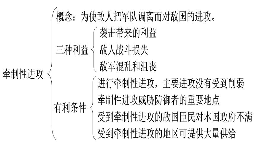 会战是消灭敌人的主要方式;战略机动也可以获得一些利益;牵制性进攻有些类似于《三十六计》中的调虎离山,通过牵制性进攻来调离敌人的军队,从而有利于另一个战场的胜利。牵制性进攻指:为使敌人把军队调离而对敌国的进攻。牵制性进攻有三种利益,包括:袭击带来的利益;敌人战斗损失;敌军混乱和沮丧。牵制性进攻要使敌人调出的军队多于我方,使得我方在主要战场形成兵力优势。对牵制性进攻有利的条件可能有四种,包括:进行牵制性进攻,主要进攻没有受到削弱;牵制性进攻威胁防御者的重要地点;受到牵制性进攻的敌国臣民对本国政府不满;受到牵制性进攻的地区可提供大量供给(如图10所示)。