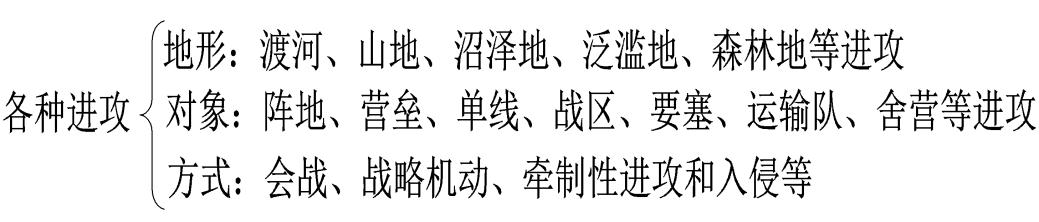 进攻有很多分类,按照地形分类有渡河进攻、山地进攻、沼泽地进攻、泛滥地进攻和森林进攻等。按照进攻对象分类有阵地进攻、营垒进攻、单线进攻、战区进攻、要塞进攻、运输队进攻和舍营进攻等。按照进攻方式可分为会战、战略机动、牵制性进攻和入侵等(如图9所示)。