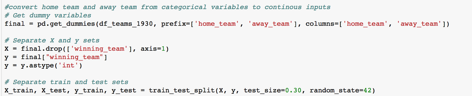 通过设置哑变量(dummy variables),我们将 home_team(主场队伍)和away _team(客场队伍)从分类变量转换成连续的输入。