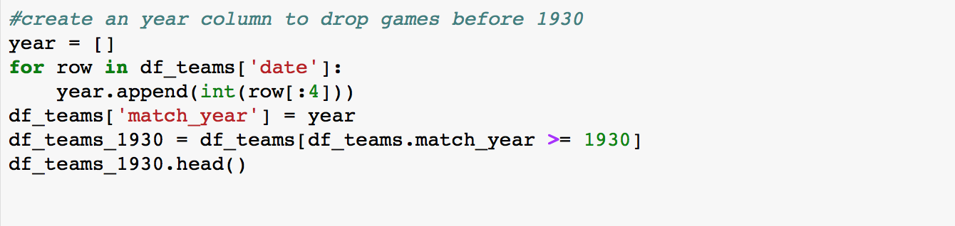 第一届世界杯于 1930 年举行。我们为年份创建一列,并选择所有 1930 年之后举行的比赛: