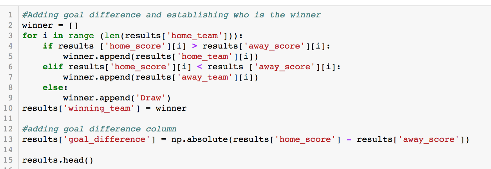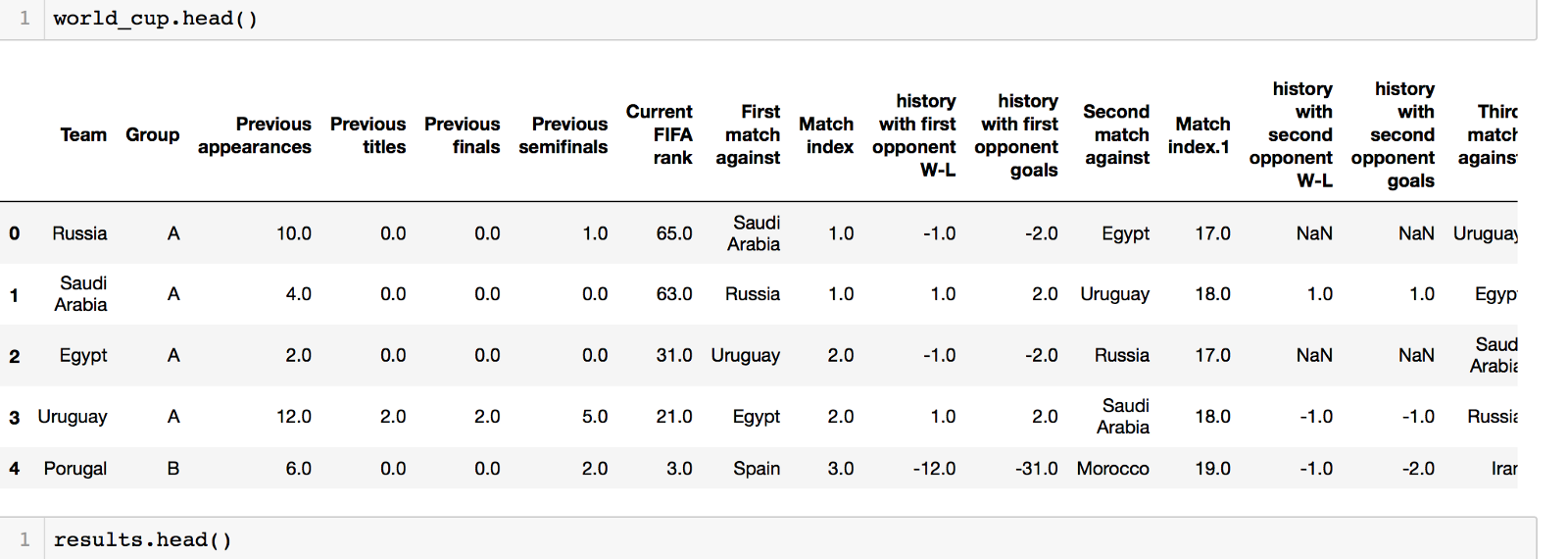 下一步是加载数据集。通过调用 world_cup.head() 和 results.head() ,务必将两个数据集都加载到数据框中,如下所示: