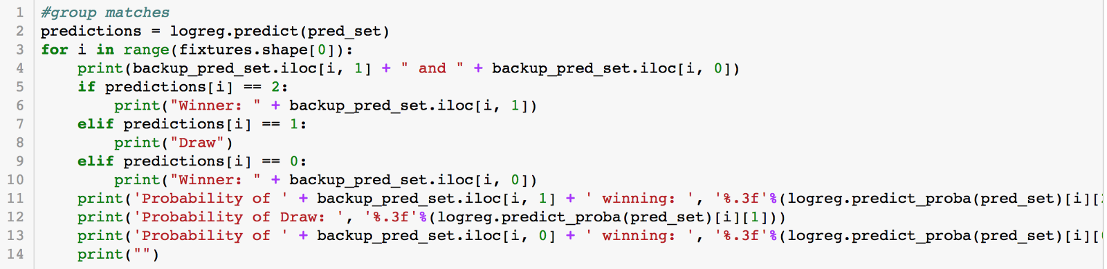 首先我们加载 2018 年 4 月 FIFA 排名数据和小组赛分组状况的数据集。由于世界杯比赛中没有“主场”和“客场”,所以我们把 FIFA 排名靠前的队伍作为“喜爱”的比赛队伍,将他们放到“home_teams”(主场队伍)一列。然后我们根据每个队伍的排名将他们加入到新的预测数据集中。下一步是创建默认变量,并部署机器学习模型。