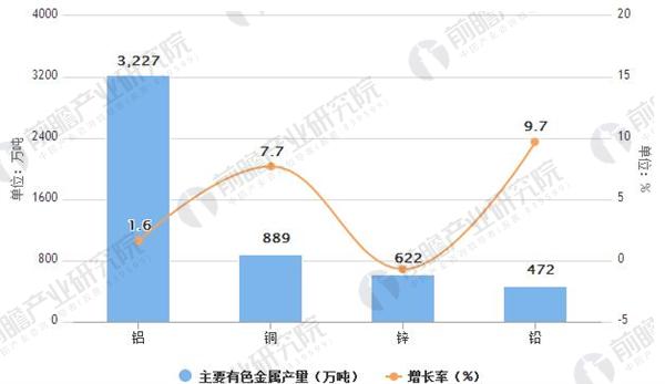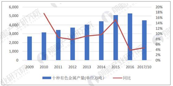 据前瞻产业产业院发布的《有色金属行业市场前瞻与投资战略规划分析报告》数据显示,2017年,十种有色金属产量5378万吨,同比增长3.0%。其中,铜、铝、铅、锌产量分别为889万吨、3227万吨、472万吨、622万吨,同比增长7.7%、1.6%、9.7%、-0.7%。规模以上有色金属工业增加值累计同比增长0.7%。