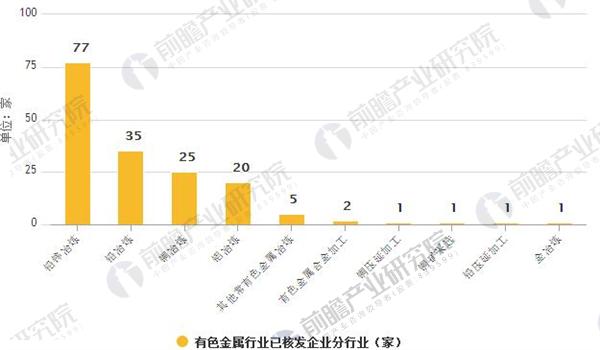目前,有色金属行业已核实的企业数量为168家。其中从行业分布来看,已核发的企业数量以铅锌冶炼、铅冶炼、铜冶炼和铝冶炼较多;从省份分布来看,云南省已核发企业数量最多,整体来看,多分布于华北地区。