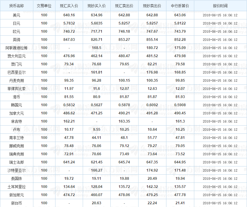 中国银行外汇牌价 2018-06-15(图片来源:东方财富网)