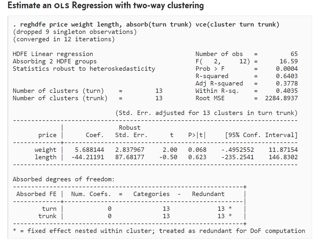 - Categories:表示你指定的每个固定效应的类别数量。比如,如果有一个固定效应对应于10个不同的地区,则Categories为10。