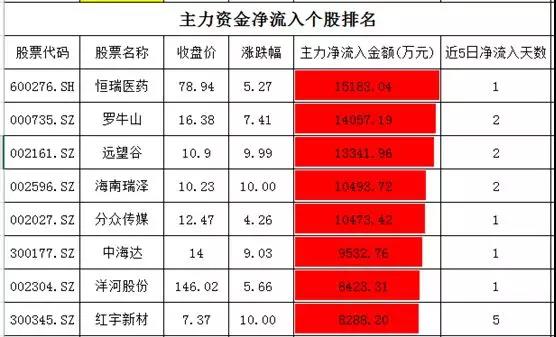 个股资金方面,恒瑞医药、罗牛山和远望谷大涨,资金净流入超过1亿元,分众传媒上涨超过4%,资金净流入也超过1亿元。