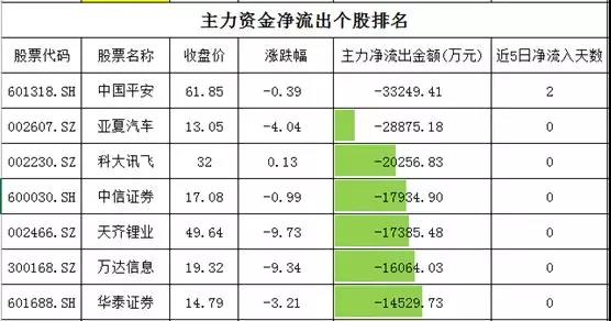 资金净流出的个股中,中国平安净流出超过3亿元,亚夏汽车、科大讯飞净流出超过2亿元,图上其余个股均有超过1亿元的净流出。
