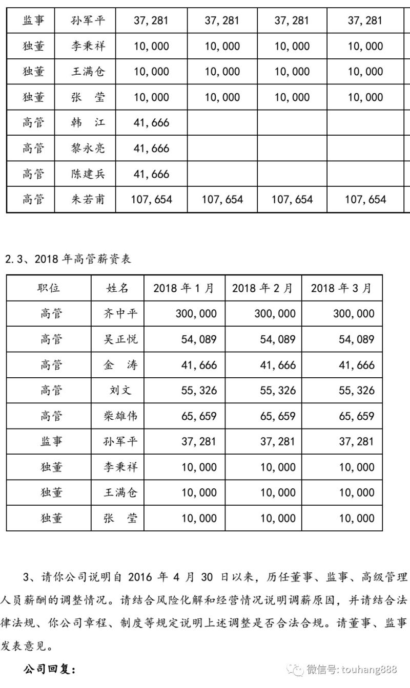 2016年12月公司全体高级管理人员薪酬平均上调 67%,其中朱若甫工资由65 万/年上涨到 130 万/年,涨幅100%。由于此次集体调薪时间久远,且公司高管变动频繁,调薪的必要性不详,亦未发现与法律法规、公司章程、制度相违背的之处。2017 年 12 月,根据各高级管理人员的表现情况,时任董事长决定对如下人员进行调薪:总经理薪酬由税后8.3万/月调整为税后18万/月;经营副总经理薪酬由36930元/月调整为 65660元/月,本次调薪事项已由时任董事长按惯例向薪酬委员会通报。公司通过本次薪酬的结构性调整与人员的优化组合,精简冗员相结合,使得目前公司总部的薪酬总额保持在55万/月左右。此次调整,化解了核心团队溃散的风险,提高了团队士气与凝聚力,暂时维持住了经营团队,令监管部门的来往函件能够正常回复,确保年报审计的正常推进,使得保壳工作有了稳定的组织基础。截止本问询函回复日,公司仍然存在所有在岗员工集体离职的可能,对公司的年报季报按期披露工作构成重大不利影响。