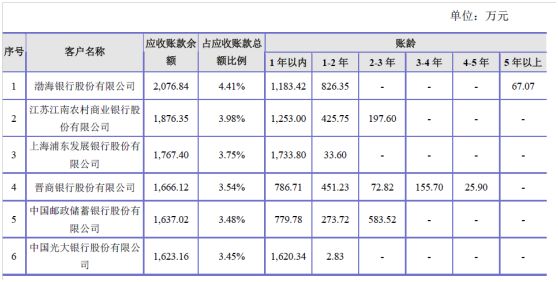 2014-年至2016 年,公司前十名应收账款合计金额分别为10,468.92万元、14,141.64 万元和15,710.23 万元,占应收账款余额的比重分别为42.70%、35.54%和33.36%。报告期内,公司应收账款前十名客户主要为银行机构,伴随着公司销售规模扩大,客户数量逐步增加,业务领域逐步扩大,2013 年开始公司大力拓展新兴业务如直销银行、金融开放平台等互联网金融新产品,使得应收账款增长较快,前十名客户应收账款占比有所下降。