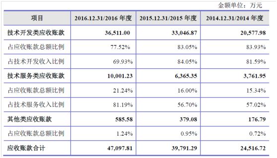 报告期内,公司技术开发业务收入形成的应收账款占全部应收账款的比重较高,分别达到83.93%、83.05%和77.52%,由于技术开发类收入中定制化开发按阶段确认收入并结算,质保金计入应收账款的特点,技术开发形成的应收款项占该类营业收入比例总体较高,2014-2016 年分别为81.59%、84.05%、69.93%,与之相比,技术服务类应收账款占相应收入的比重稍低,2014-2016 年分别为57.02%、56.70%和81.19%。