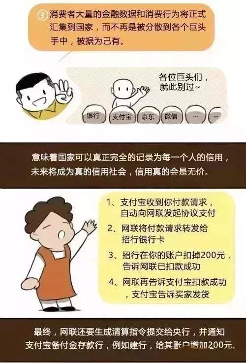 这样消费者大量的金融数据和消费行为将正式汇聚到国家。而不是被各个支付行业的巨头占有。同样意味着国家直接记录我们的信用,将来会是一个信用的社会,信用真的会是无价的。