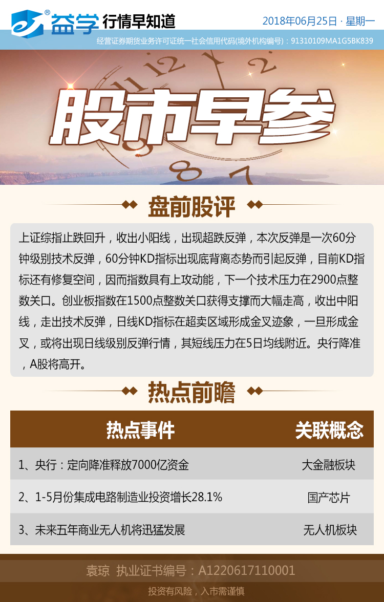 上证综指止跌回升,收出小阳线,出现超跌反弹,本次反弹是一次60分钟级别技术反弹,60分钟KD指标出现底背离态势而引起反弹,目前KD指标还有修复空间,因而指数具有上攻动能,下一个技术压力在2900点整数关口。创业板指数在1500点整数关口获得支撑而大幅走高,收出中阳线,走出技术反弹,日线KD指标在超卖区域形成金叉迹象,一旦形成金叉,或将出现日线级别反弹行情,其短线压力在5日均线附近。央行降准,A股将高开。