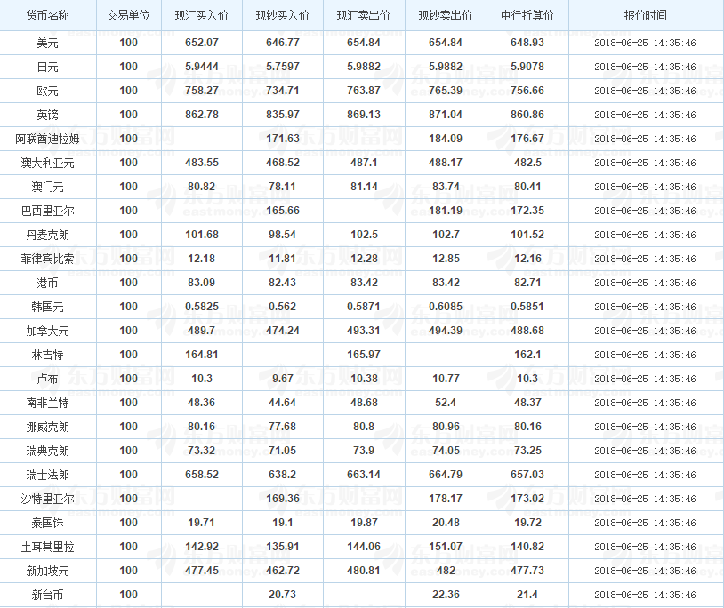 中国银行外汇牌价 2018-06-25(图片来源:东方财富网)