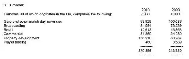 上图是英超的阿森纳足球俱乐部2010年的收入来源报表,其中门票9393万,电视转播8458万,商品4397万,可见单靠俱乐部自身的盈利能力是不足以养活球星们的。