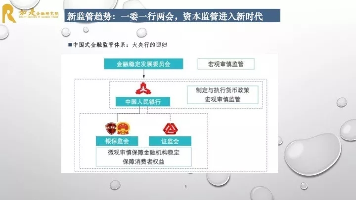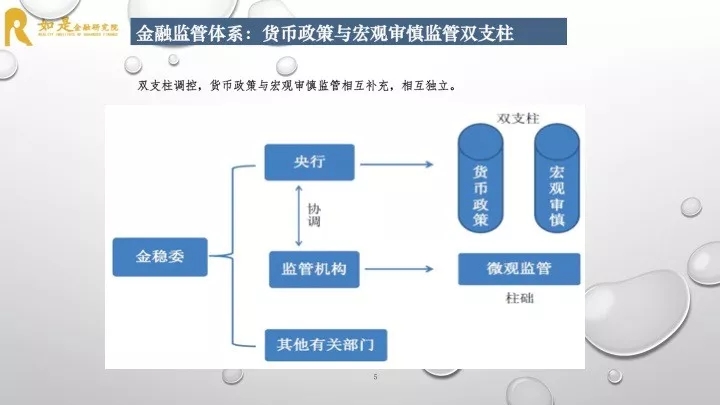 从监管框架来看,新的金融监管体系进一步明确了“双支柱”框架,即“货币政策+宏观审慎”。前者服务于传统的增长通胀等目标,后者主要是防范金融风险,这是目前国际上最新的监管趋势。