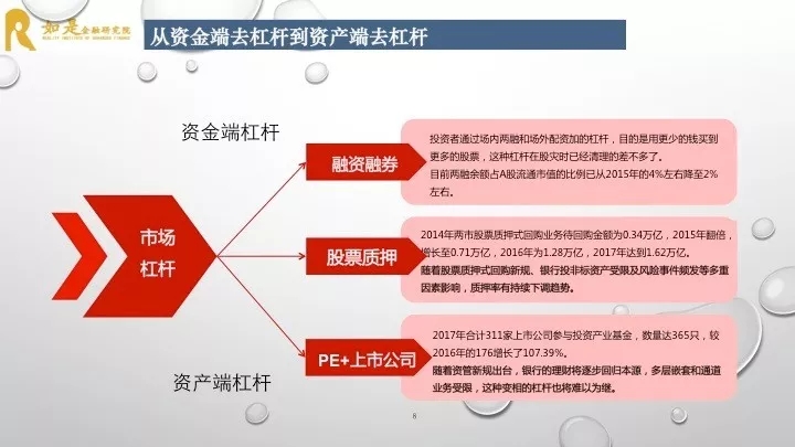 很多上市公司在2015年以后做了非常不恰当的股权质押安排,有的企业的质押率非常高,以至于在整个二级市场波动的情况下,现在出现了连环爆仓的情况,企业家失去对这个企业的控制权,这叫资产端去杠杆。