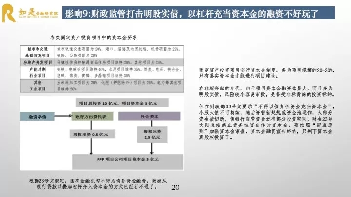 第九,财政监管打击明股实债,以杠杆充当资本金的融资不好玩了。固定资产投资项目实行资本金制度,多为项目规模的20-30%,只有落实资本金才能进行项目建设。