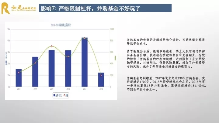 第七,严格限制杠杆,并购基金不好玩了。并购基金的优势的是通过结构化设计、回购承诺安排等降低资金成本。