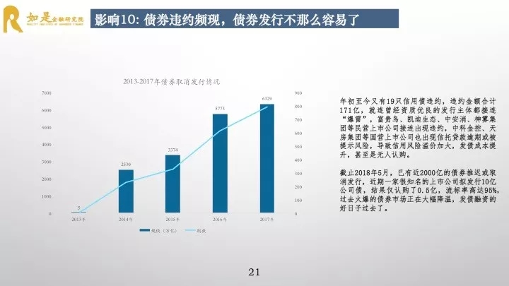 第十,债券违约频现,债券发行不那么容易了。随着金融去杠杆趋严,货币政策趋紧,加上打破刚兑导致违约事件频发,债券市场的好日子到头了,企业发债融资也不再那么便宜了、那么容易了。
