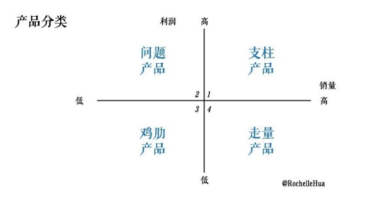 参考下图,我用利润和销量替换了波士顿矩阵中的两个要素,从而把公司的产品线进行了分类。