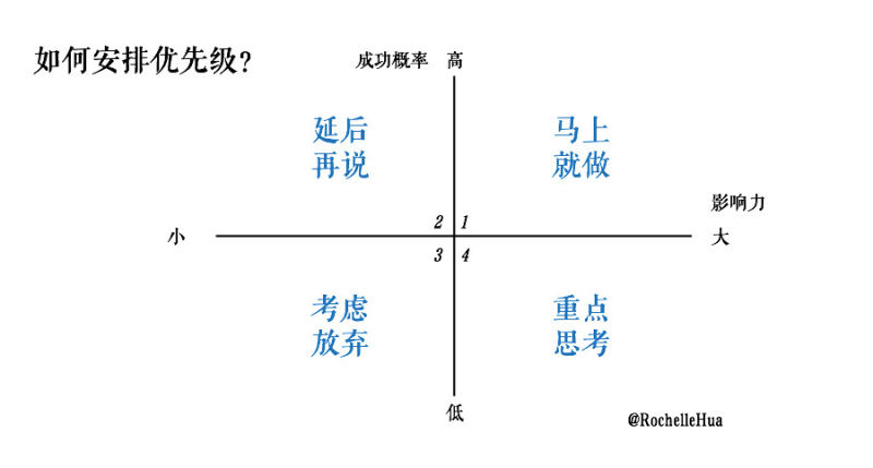 大家熟悉的时间管理的四象限,重要 vs 紧急 的模型这里不赘述啦。我想提供另一种维度:成功率 vs 影响力。对于影响大又很容易做就成功的,是low hanging fruits,低垂的果实,我们应该马上取得胜利,保护战果。对于影响大但是成功率低的事情要重点思考一下,如何部署可以提高成功率,把事情从第4象限挪到第1象限。