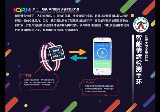 这款智能情绪检测手环由郑大学生赵帅、赵健壮、许子涵、叶自龙、周峻辉联合发明,并在11月26日结束的ICAN国际创业创新大赛中国赛区总决赛上获得了三等奖。