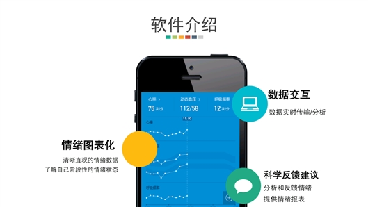 手机上安装的配套APP将接收到的数据进行分析,最终显示的结果也是数字,这些数字将直接反映出使用者当前的情绪:0~200表示愉悦,200~400表示高兴,400~700表示紧张,700~1200表示焦虑。每当你的情绪发生变化,手机APP就会做出相应的提示。比如手机上显示的数据超过1000,系统便会立刻提示使用者休息并且调整心理状态。同时,APP也会总结每日的情绪数据,将使用者每周的情绪变化通过折线统计图的形式展现出来。