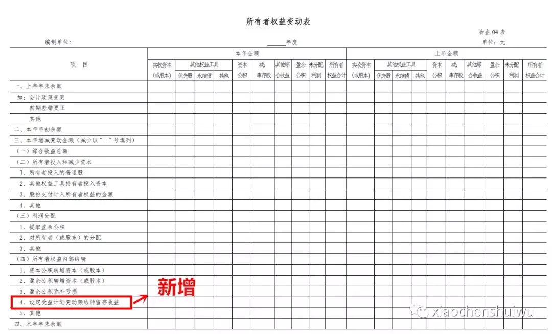 (三)所有者权益变动表主要落实《〈企业会计准则第9号——职工薪酬〉应用指南》对于在权益范围内转移“重新计量设定受益计划净负债或净资产所产生的变动”时增设项目的要求: