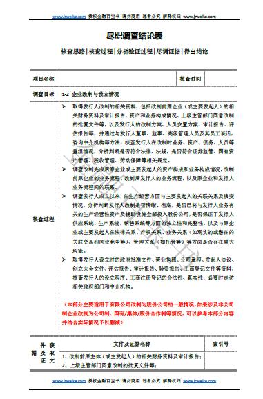 9:这个《尽职调查结论表》按“1-1”这样的二级目录再加上《财务核查尽职调查结论表》一共有100多份文件吧。《财务核查尽职调查结论表》每家券商对14号文和551号文,解读不一样,也准备多写二家券商类型的给大家参考。我们也是端人饭碗、拿死工资的,只能抽空慢慢写了。如果有网友因为项目或工作原因需要提前了解某个调查目录的《尽职调查结论表》可以给客服留言,我们不一定要按照目录的顺序来写。