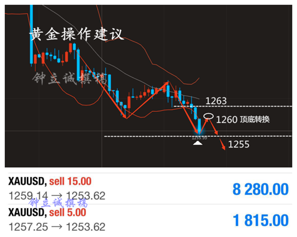小时图上来看依旧是震荡下跌走势,此时的低点已在被突破,不能确定是否可以抄底,那么只要这种震荡下行的走势不打破,我们依旧是反弹做空为主,什么时候打破这种走势,再来调整思路看调整行情,今日上方1261的前期低点强支撑转化为的压力位置,沽空即可,另外我们再看下基本面,近期国际形势不容乐观,但是很明显的资金并没有涌入黄金市场,反而出来一个避险事件,美元涨一波,美元在当前形势下的避险属性是明显要高于黄金的,所以基本面上不要太过于看重黄金的避险属性,目前美元依旧是在冲高中,日线上美元上方依旧还是有空间的,综上考虑,黄金不要过分看多,一切多单都只能短多博反弹操作,至于抄底,千万不要有这种想法,重点上方压力位置:1262,下方支撑位置:1250,破位持有。