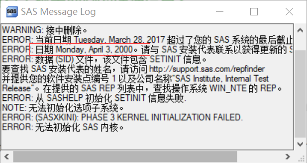 2. C:\Program Files\SASHome\SASFoundation\9.3\nls\zh\SASCFG”解决了上述问题。但是有一个问题一直解决不了,我的SAS9.4SID是2017年的,但是弹出的框框却让把时间调到2000年,不知道是什么原因?感谢回答!