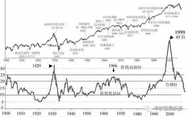 上图是美国道琼斯工业指数的100年的风雨路。可以看到,尽管经历无数天灾人祸的沉重打击,长期股指仍然是一路向上,虽然每次市场悲观的理由各有不同,但是当市场处于10倍左右市盈率区间时去购买股票是不会错的。这个购买过程中也可能会好几年的煎熬,不会一买就涨,但是在低估区间耐心持有终将胜利。而当股票指数处于20倍市盈率以上区间时,同样也有无数的理由来论证高市盈率的合理性以及对前景无限看好,但股票资产已经处于泡沫化,长期投资回报率下降。