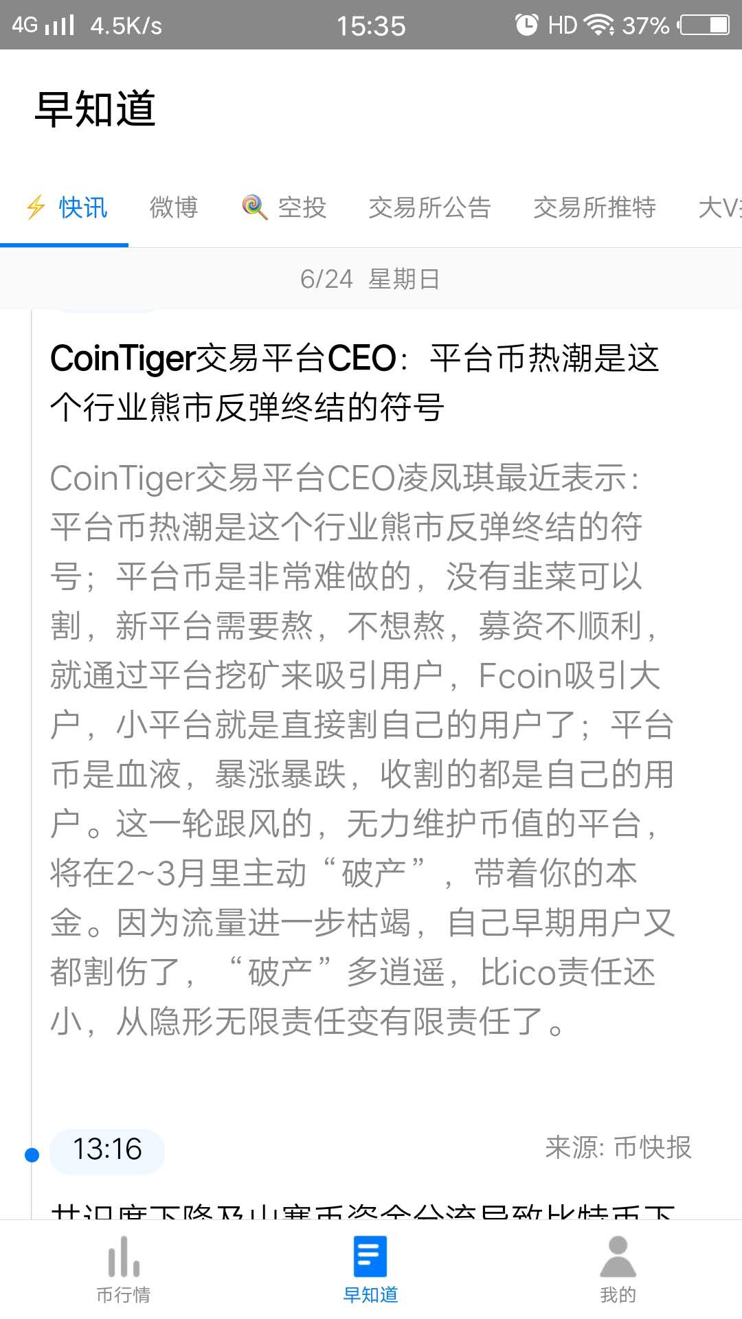 【CoinTiger交易平台CEO:平台币热潮是这个行业熊市反弹终结的符号】6月24日,据虎嗅网消息,CoinTiger交易平台CEO凌凤琪最近表示:平台币热潮是这个行业熊市反弹终结的符号;平台币是非常难做的,没有韭菜可以割,新平台需要熬,不想熬,募资不顺利,就通过平台挖矿来吸引用户,Fcoin吸引大户,小平台就是直接割自己的用户了;平台币是血液,暴涨暴跌,收割的都是自己的用户。这一轮跟风的,无力维护币值的平台,将在2~3月里主动“破产”,带着你的本金。因为流量进一步枯竭,自己早期用户又都割伤了,“破产”多逍遥,比ico责任还小,从隐形无限责任变有限责任了;各类Token应该放弃支付和现实场景,彻底走向Mindset,为我们意识中真正有价值的实体提供流动性。