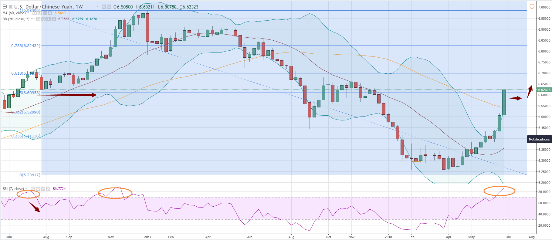 本次美元的升势,某程度上是美国针对中国开打贸易战而形成的,所以美元兑离岸人民币(USDCNH)的升势也最为剧烈。今晨开始美元离岸人民币汇价从近期高点6.65开始回落,令到一众非美货币也出现了明显反弹,当中欧元丶澳元的升势最为明显。日线图上,RSI超过70之後汇价通常很快回落,所以短期非美货币或会出现较明显反弹。图表上,近期美元兑离岸人民币跌势的61.8%费波回档水平在6.7,预料在汇价回调之後仍有可能再向6.7走高。美元即使短期走弱,但暂时我们仍维持中期美元继续强势的看法,直至确定趋势结束。