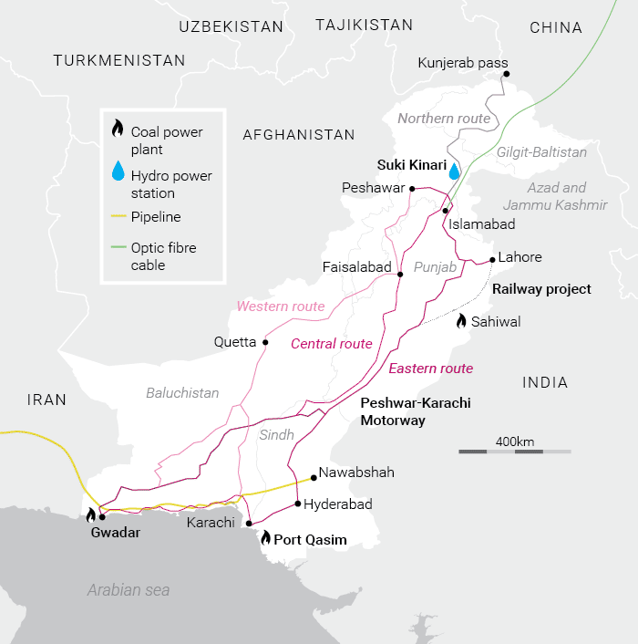 中国-巴基斯坦经济走廊是一带一路旗下规模最大的项目,估计价值540亿美元的基础设施项目。从中国的新疆到巴基斯坦的瓜达尔港口修建公路花费了几十年的时间,但它终于部分投入使用了。去年年底,中国货物开始陆路运往瓜达尔港口。最终,瓜达尔和卡拉奇的海港将与巴基斯坦北部、中国西部和中亚相连。 中国交通建设集团董事长刘启涛表示,修建公路一直很困难。 "我们花了数十年时间,已经有88名中国工人死于自然灾害。"。